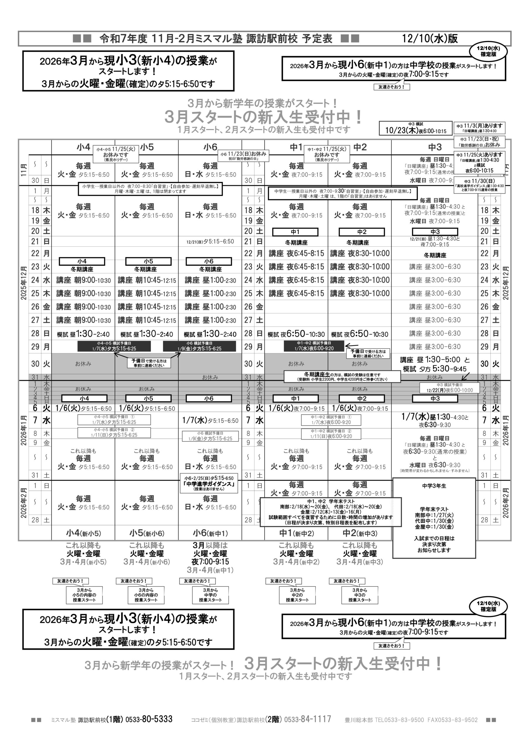 ■来年度(令和7年度)(2025年度)の新しい学年で表記しています■2025年3月1日からの時間割です■ミスマル塾は3月から新年度がスタートします