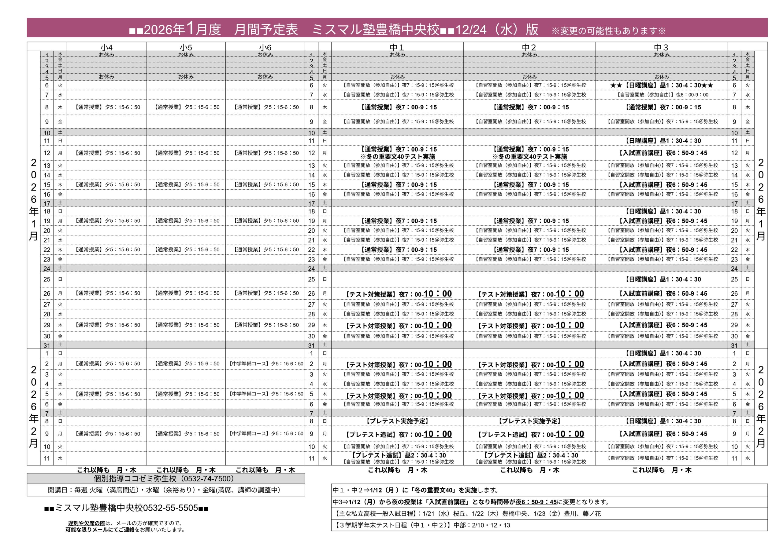 ※2026年3月1日~の時間割です。※学年は新学年表記です※’【★重要★】2026年3月以降の授業は、校舎統合に伴い『弥生校』にて実施いたします。