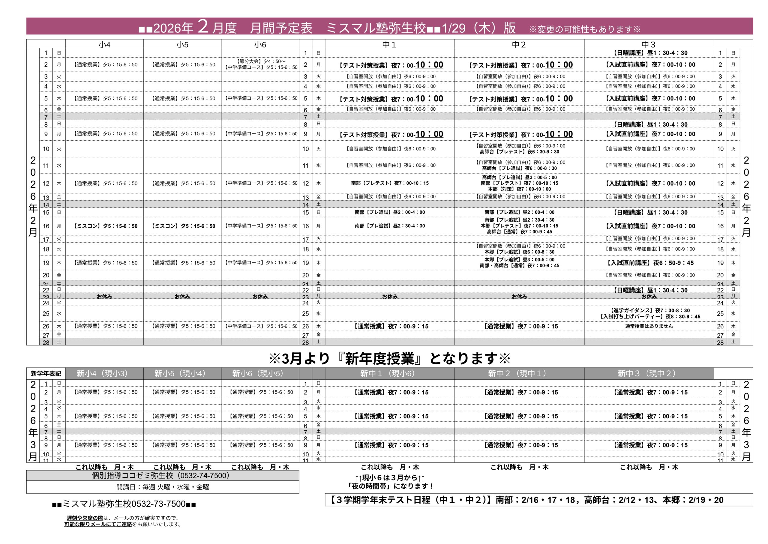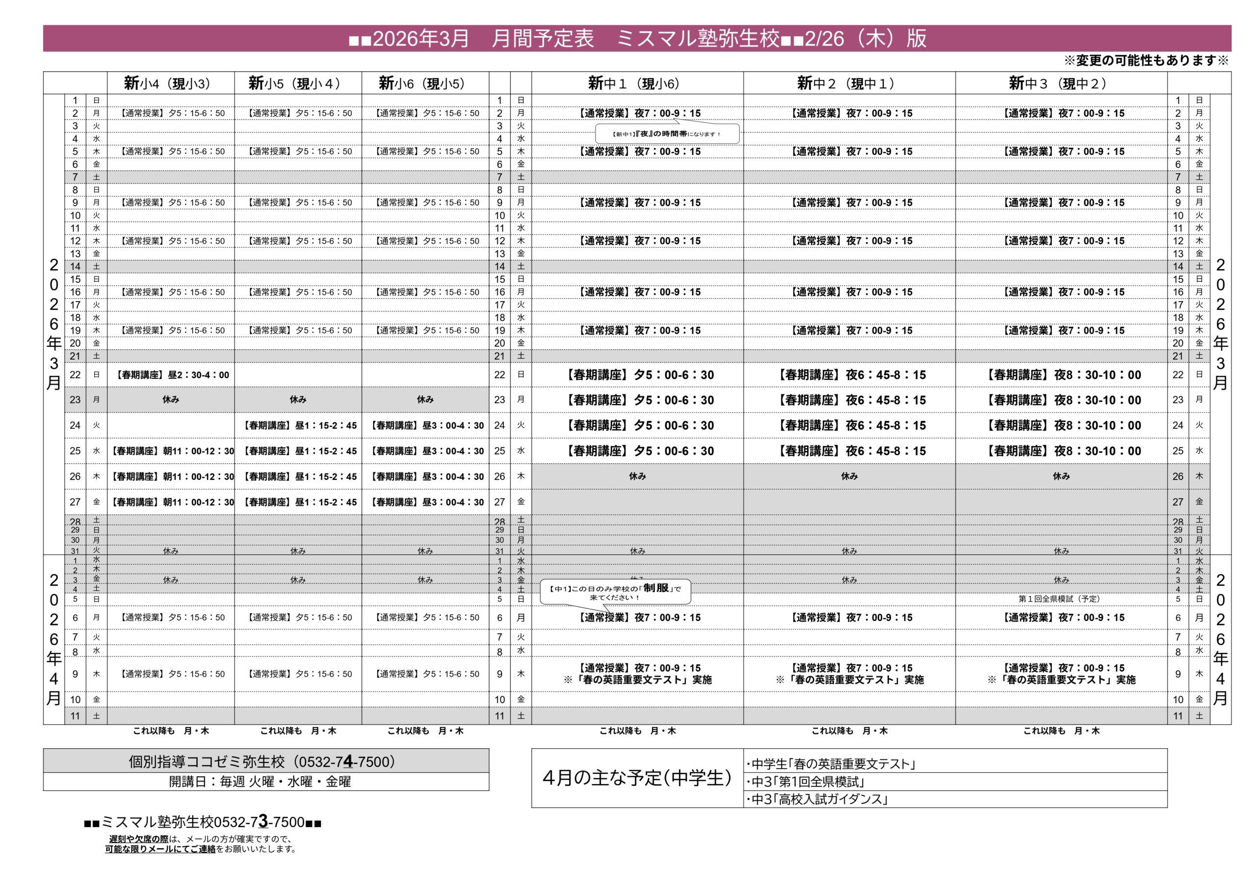 弥生校の3月の予定表は⇒コチラから