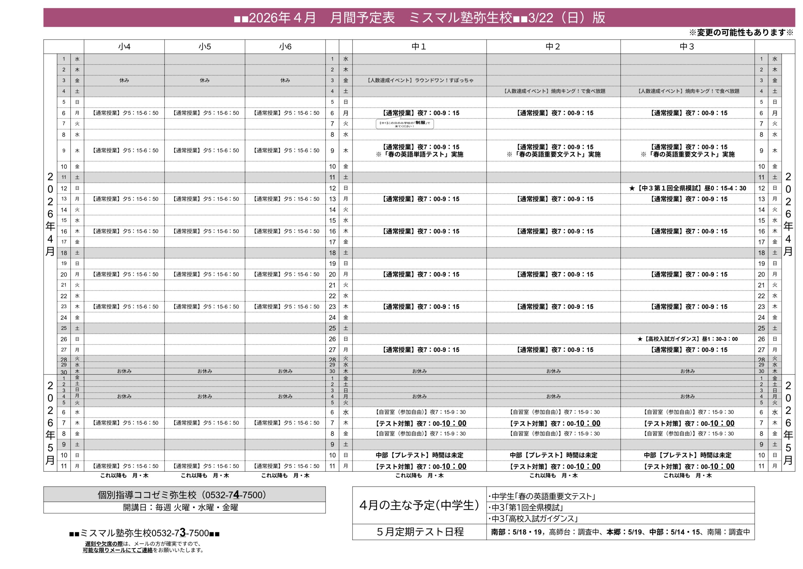 弥生校の4月の予定表は⇒コチラから