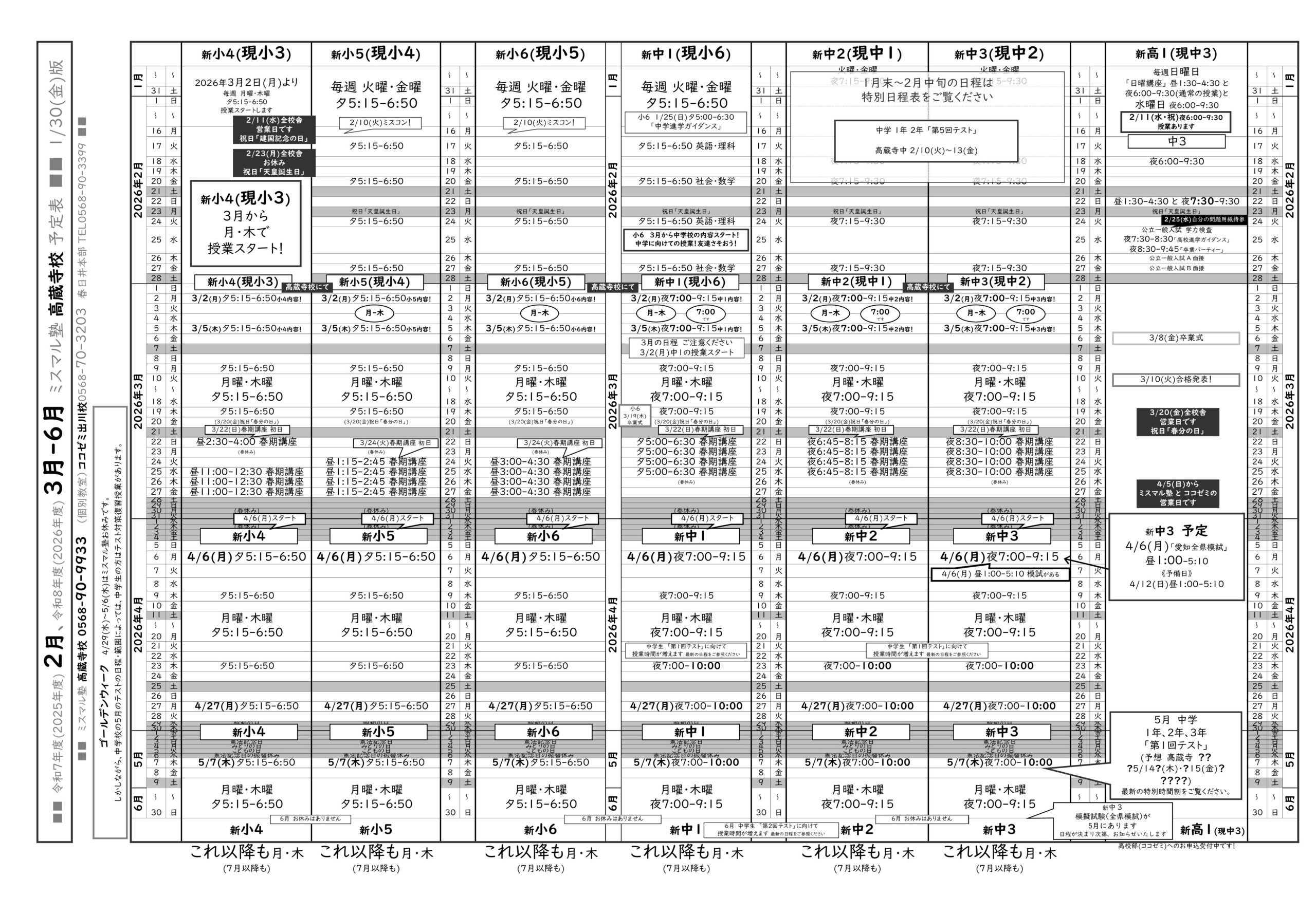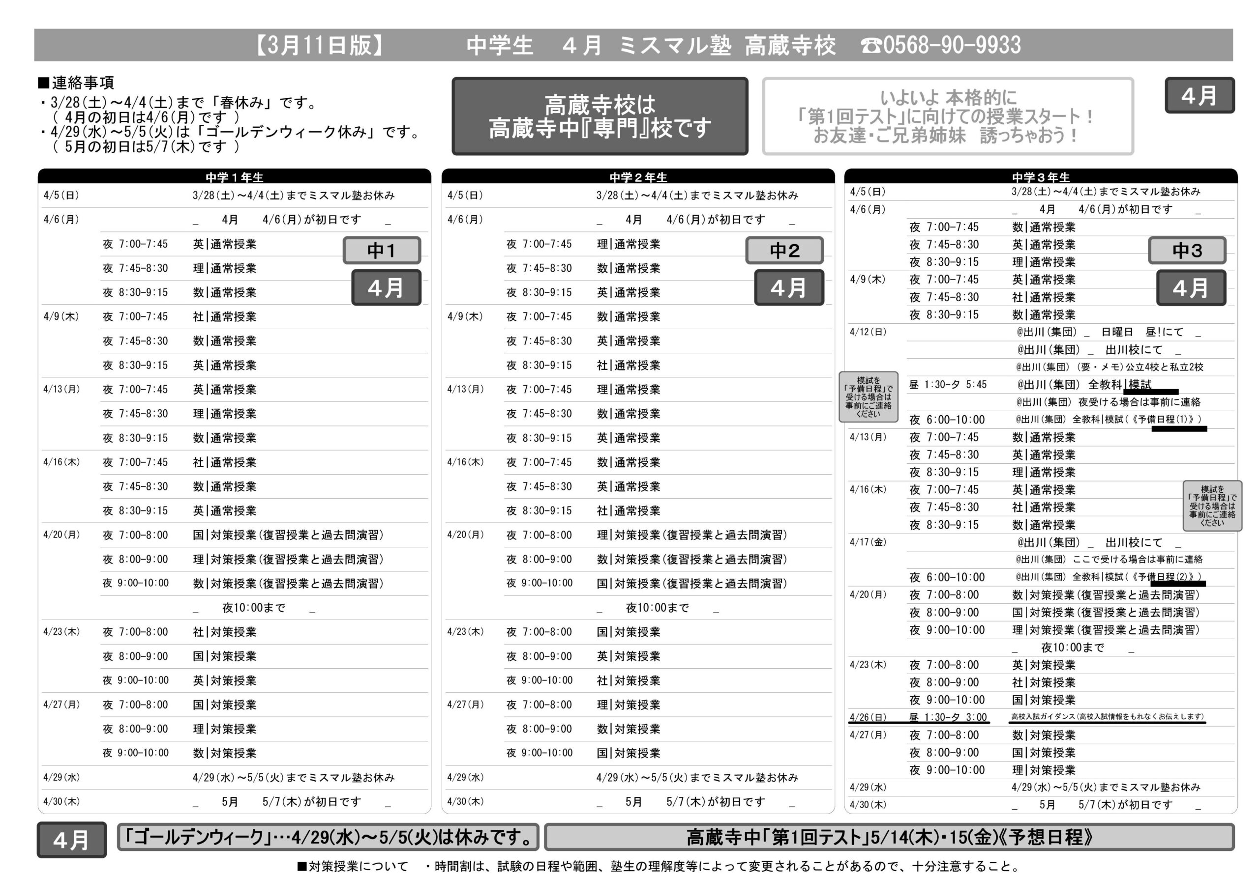 ついに、高蔵寺中『専門』校舎が誕生! ★ミスマル塾高蔵寺校3月新規開校 毎週月・木 ※ミスマル塾は上記の7中学校に限定してこだわりの指導を行っております。 (2026年1月6日更新)