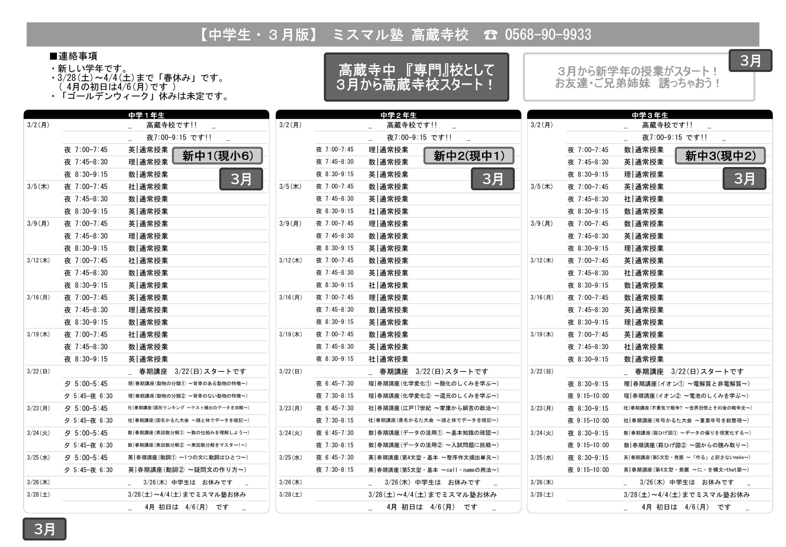 昨日より、いよいよ新学年の授業が始まりました。 おかげさまで多くの反響をいただき、「高蔵寺中専門の塾」として地域の皆さまからの期待の大きさを身が引き締まる思いで感じております。 私たちは、地域で最も信頼される塾を目指し、日々全力で教壇に立ってまいります。 3月末には「春期講座」も控えており、最高のスタートダッシュを切る準備は万端です!ミスマル塾は高蔵寺中の生徒たちの成績アップに情熱を注いでまいります。ぜひご期待ください。 (荒井) |