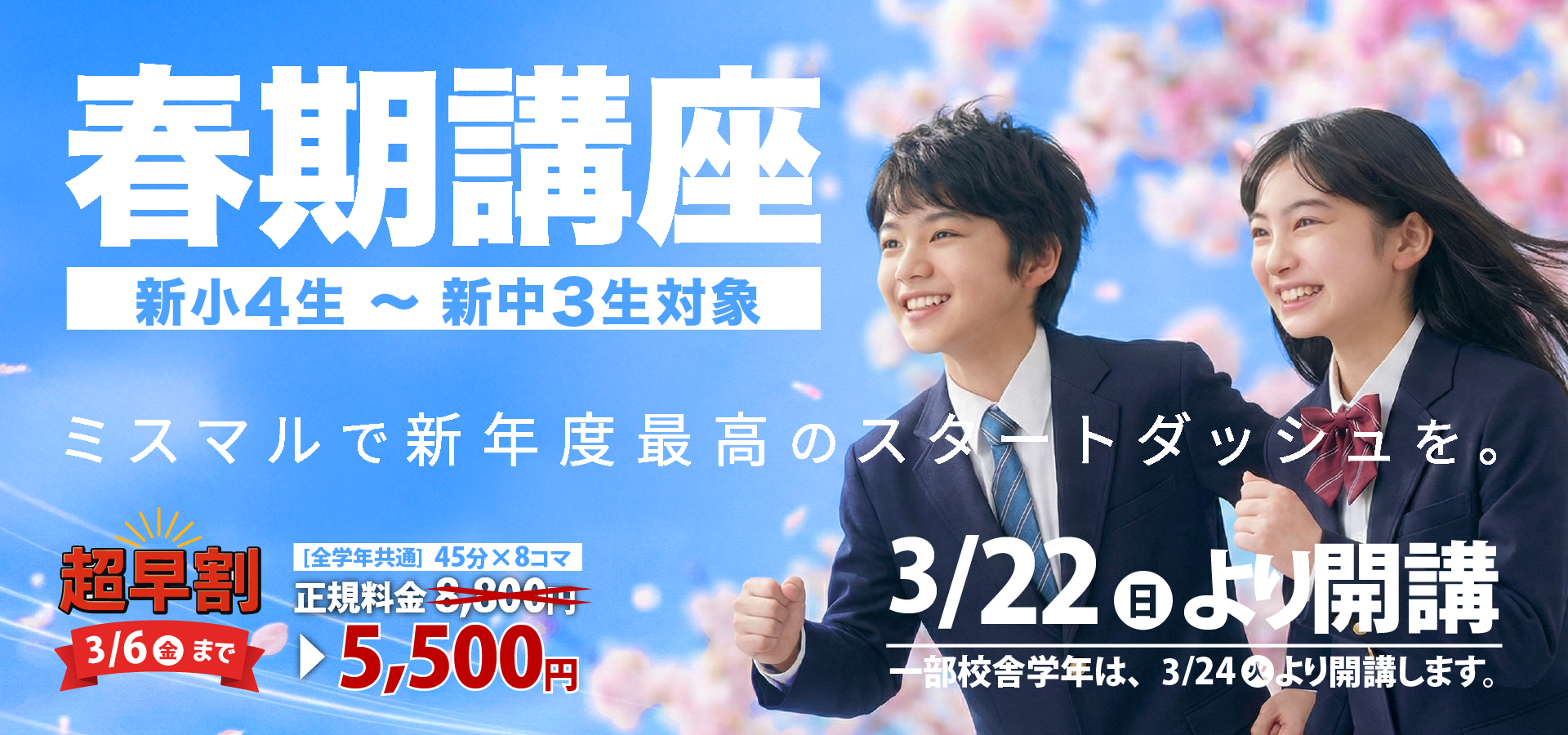 | 新小4 | 3/24(火)〜27(金)の4日間 | 午後 1:15〜2:45 | 3/22(日) | 午後 2:30〜4:00 |